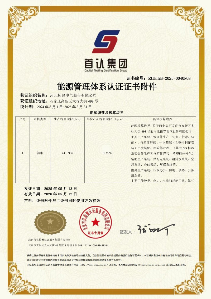 近日,我司—— 河北拓普電氣股份有限公司憑借完善的能源管理體系建設(shè)、卓越的能源管控能力以及全員參與的節(jié)能降耗實(shí)踐,順利通過(guò)北京首認(rèn)檢測(cè)認(rèn)證服務(wù)集團(tuán)有限公司的嚴(yán)格審核,正式獲得能源管理體系認(rèn)證證書(shū)!這一認(rèn)證的取得,標(biāo)志著我司在能源管理標(biāo)準(zhǔn)化、規(guī)范化、系統(tǒng)化建設(shè)方面邁出了堅(jiān)實(shí)一步,更是我司踐行綠色發(fā)展理念、推動(dòng)可持續(xù)發(fā)展的重要里程碑!